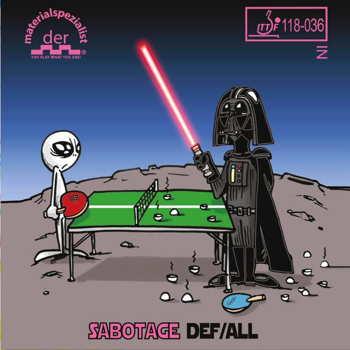 der materialspezialist SABOTAGE basiert auf einem normalen Noppeninnenbelag, besitzt aber aufgrund seiner neu entwickelten Gummimischung und eines weltweit einmaligen Herstellungsprozesses, kaum bis gar keine Oberflächenreibung.