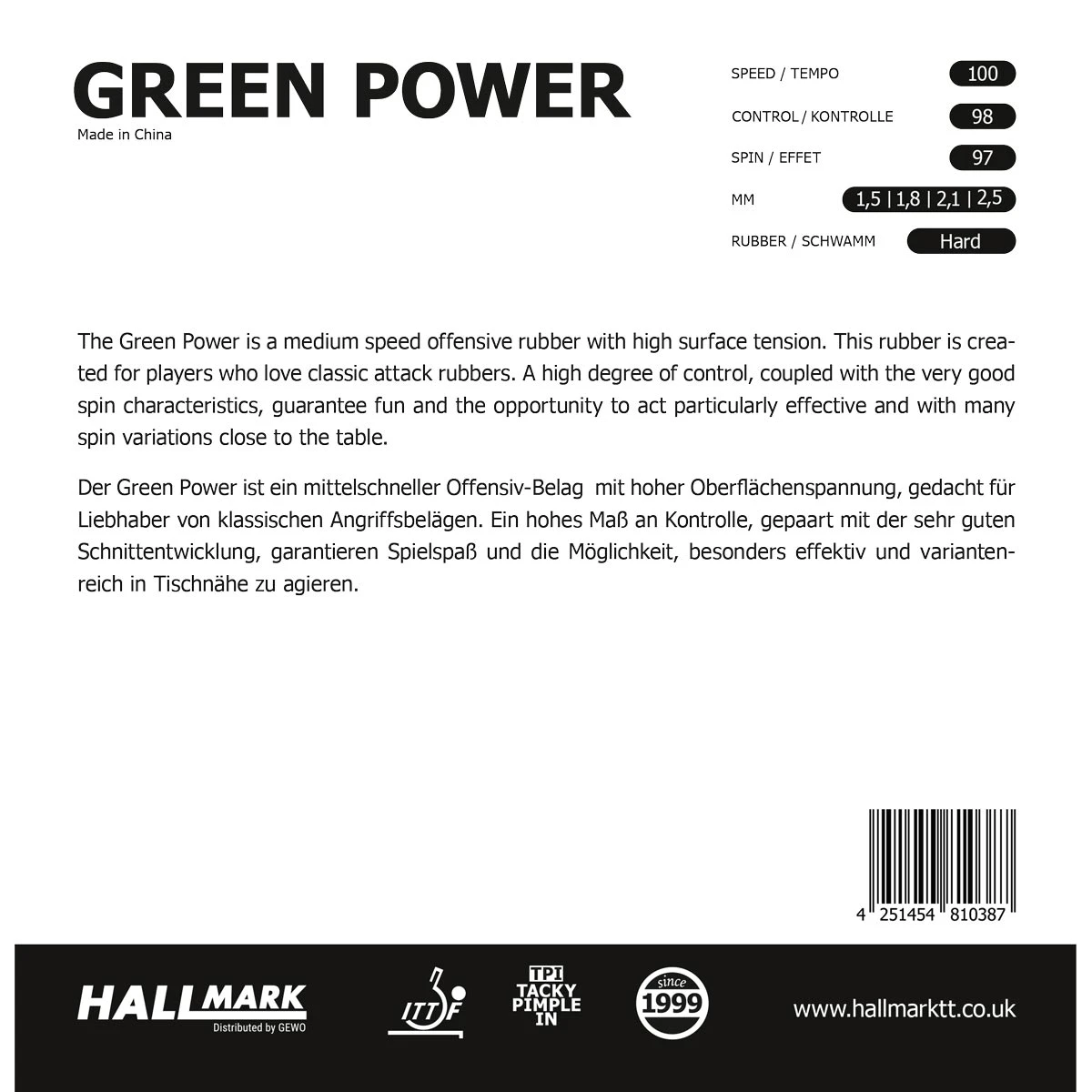 Der Green Power ist ein mittelschneller Offensiv-Belag mit hoher Oberflächenspannung, gedacht für Liebhaber von klassischen Angriffsbelägen.